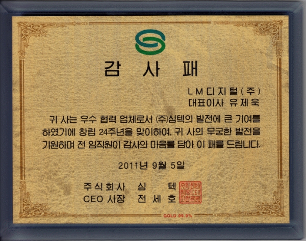 2011년 9월 5일 심텍으로 부터 우수 협력업체 감사패 수여